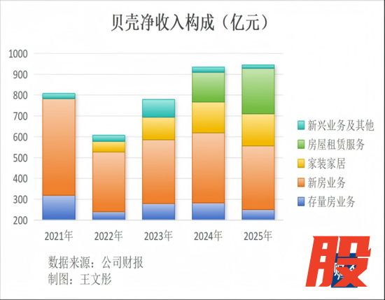 财报显示,2025年贝壳的新房业务和存量房业务净收入分别为306亿元和250亿元,同比分别下降9.2%、11.4%,降幅分别扩大19.4个百分点、12.1个百分点。二者净收入合计在总净收入中占比为58.83%,同比下降7.37个百分点。