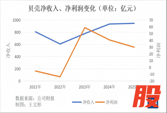 财报显示,2025年全年贝壳实现净收入(指公司实际获得的收入,等同于营业收入)为946亿元,同比微增1.2%;但净利润仅为29.9亿元,同比下滑26.7%。