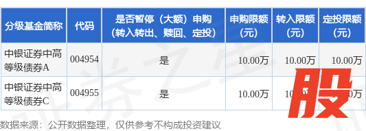 本站消息,6月18日中银国际证券股份有限公司发布《中银证券中高等级债券型证券投资基金暂停大额申购、转换转入及定期定额投资业务的公告》。公告中提示致富配资,为保护基金份额持有人利益,自2025年6月18日起中银证券中高等级债券型证券投资基金暂停大额申购、转换转入及定期定额投资业务,申购、转换转入上限金额为10.0万元,下属分级基金调整明细如下:
