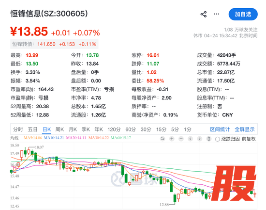截至4月24日收盘,恒锋信息报13.85元/股,年内跌超11%,总市值为22.87亿元。