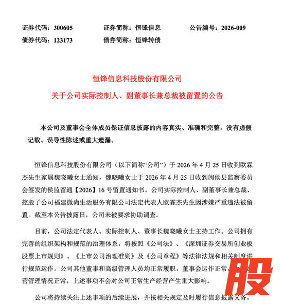 4月26日,恒锋信息发布公告称,公司于4月25日收到欧霖杰家属魏晓曦通知,魏晓曦于4月25日收到闽侯县监察委员会签发的留置通知书。公司实际控制人、副董事长兼总裁、控股子公司福建微尚生活服务有限公司法定代表人欧霖杰因涉嫌严重违法被留置。截至本公告披露日,公司未被要求协助调查。